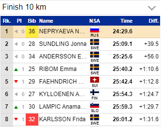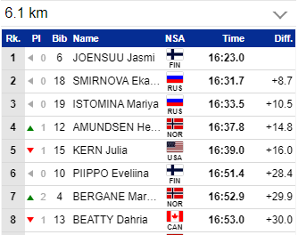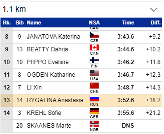 Йохауг выигрывает у Непряевой на отсечке 1,5 км 4,8 секунды.