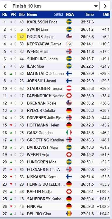 Фрида Карлссон на отсечен 3.4 км проигрывает 2 секунды, Диггинс - 6.