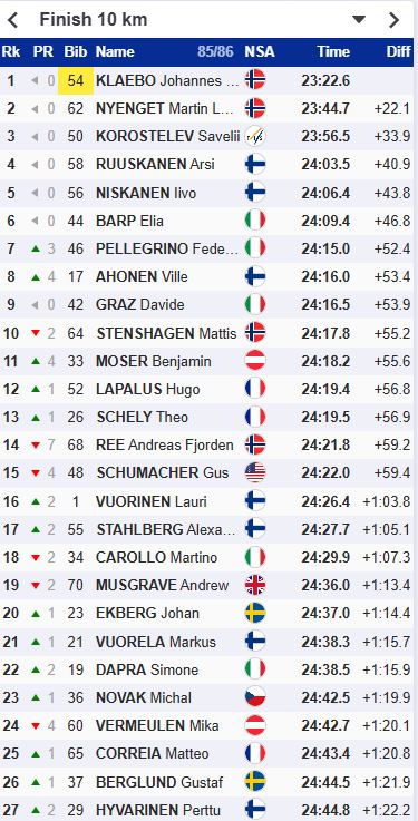 Третий результат у Нисканена, он проигрывает Клебо 16 секунд.