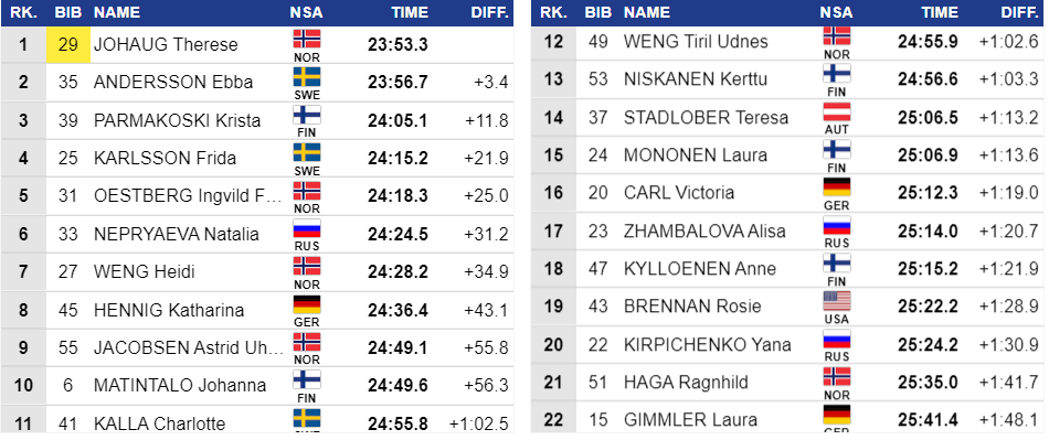 Только 4 секунды проигрывает Андерссон Терезе Йохауг, Пармакоски - 9, она уже не конкурент.