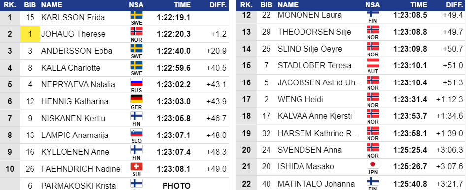 Сенсация всё же произошла, Фрида Карлссон выиграла у Терезы Йохауг. Россиянка Наталья Непряева не смогла побороться за медали, но и 5 место - это прекрасный резцльтат. Теперь ждём победу Большунова и успехов от других россиян на завтрашнем марафоне. На этом трансляция завершена, провёл её Вячеслав Горбачёв, всего хорошего.