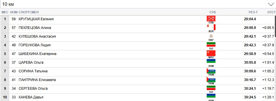 А Пеклецова после 10 км выигрывает у Кулешовой 32 секунды.
