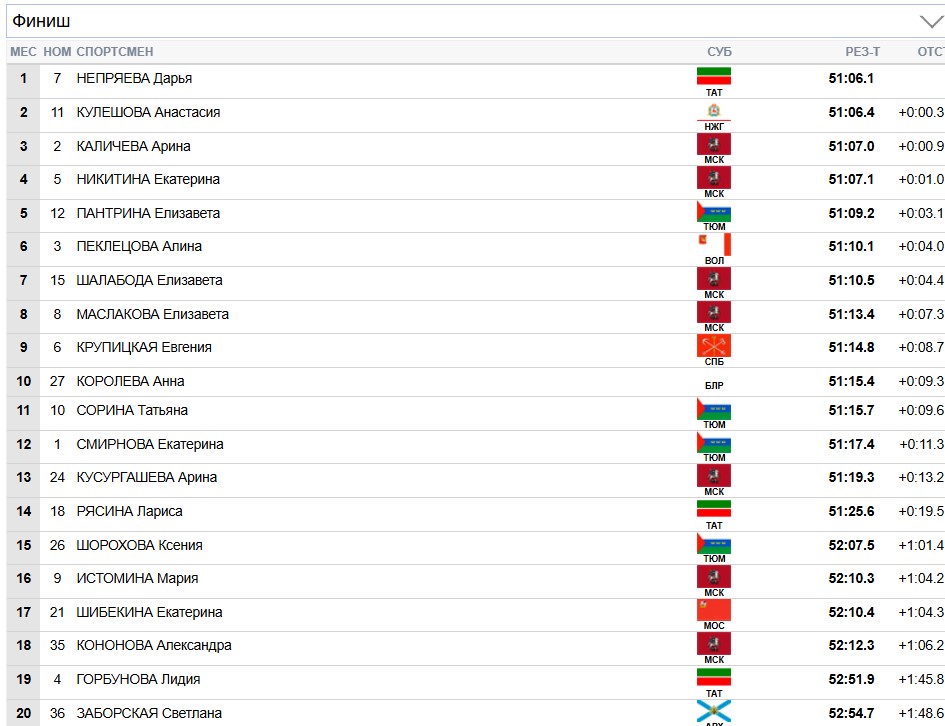 И в финишном створе Дарья Непряева побеждает Анастасию Кулешову на 0.001 секунды! Арина Каличева в борьбе за бронзу опережает на 0.002 секунды Екатерину Никитину. Гонка завершена.