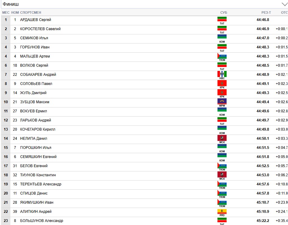 Тройка лидеров выходит на финиш и в створе побеждает Ардашев! Обошёл на 0.001 секунды Коростелёва, на 0.002 - Семикова. Большунов в итоге финишировал только 23-м. Гонка завершена.