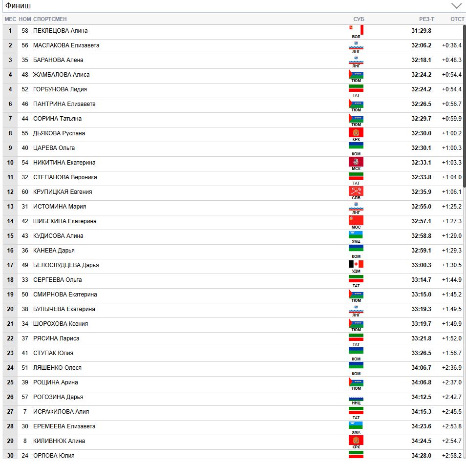 Пеклецова финиширует первой, Маслакова - второй. Баранова сегодня третья. Гонка завершена.