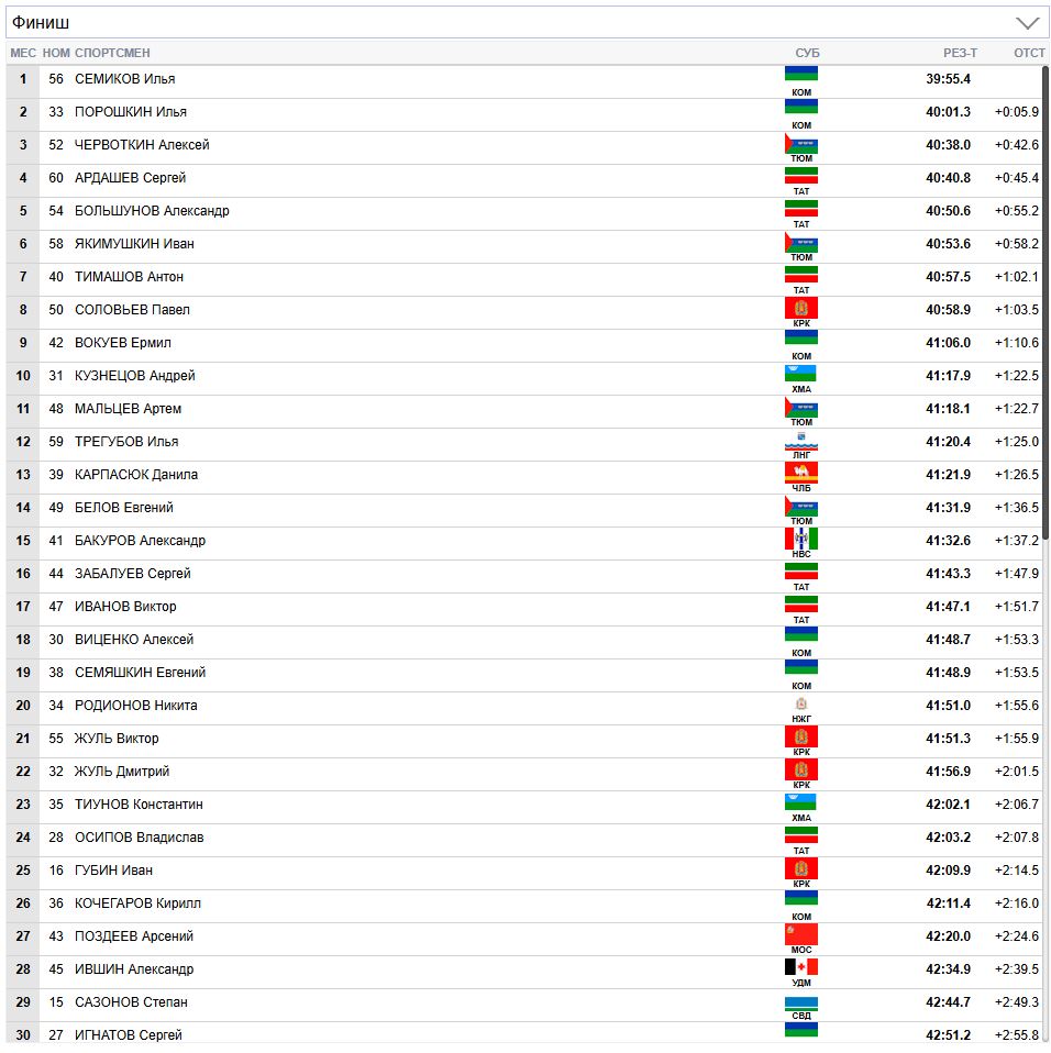 Прибавил Семиков и на отсечке 14.8 км уже более 5 секунд выигрывает у Порошкина. А Ардашев в борьбе за бронзу проигрывает 0.7 секунды Червоткину.