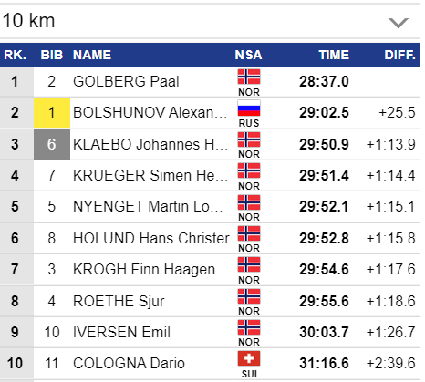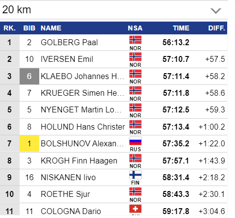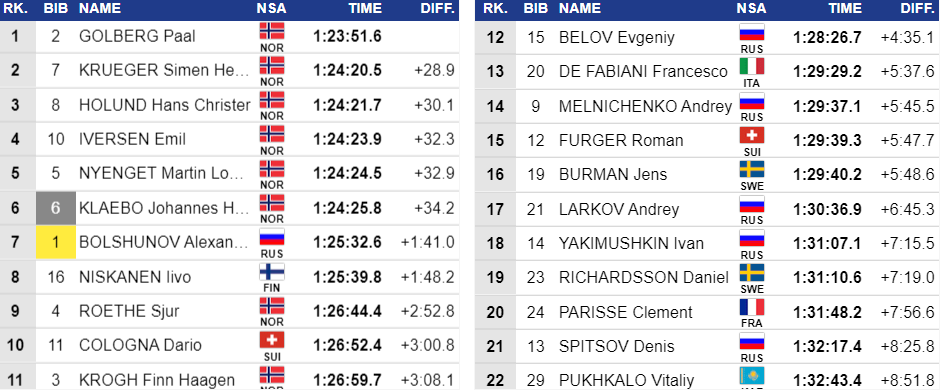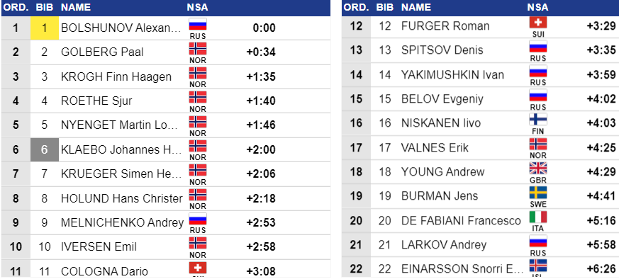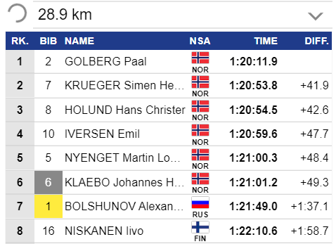 Большунов слабо начал, Голберг, Ньенгет, Рётё, Крог и Клебо отыграли у него от 16 до 20 секунд каждый.