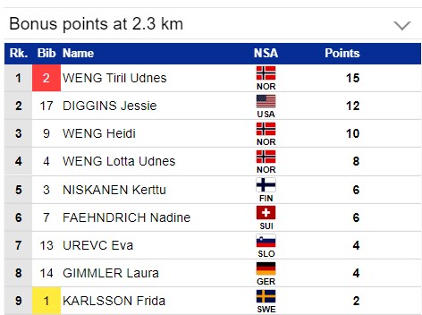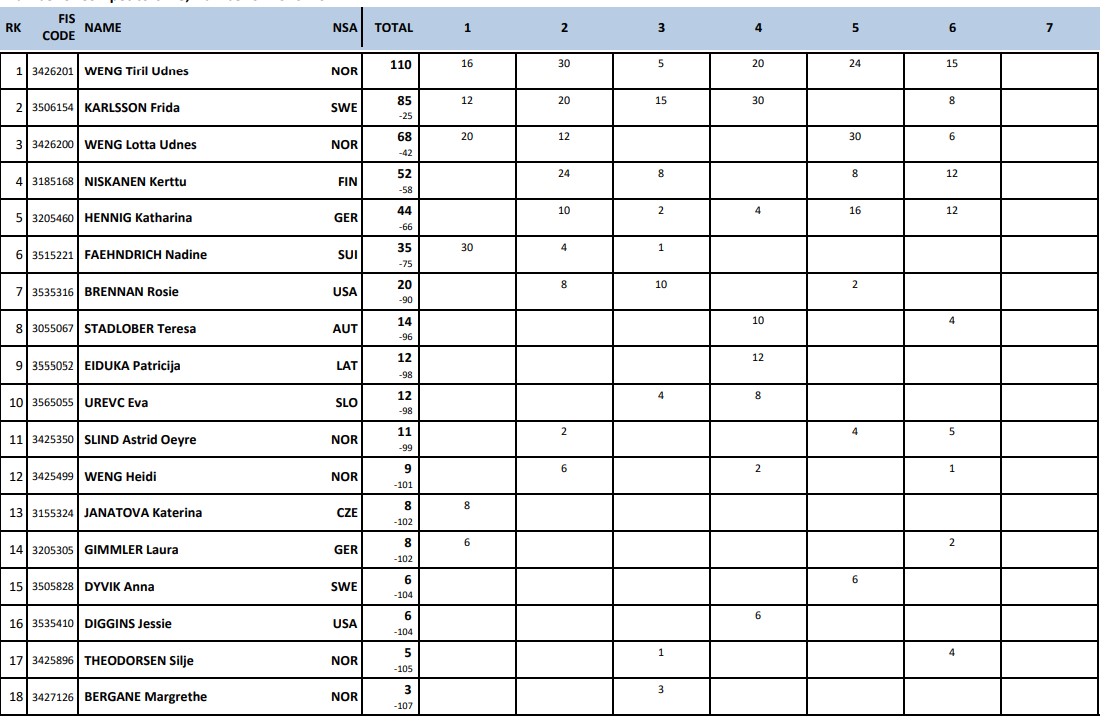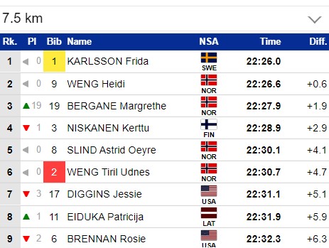 Тяжело Фриде Карлссон, она уже 6-я, но у неё большой отрыв от Тириль Венг и сложно будет проиграть этот Тур де Ски.