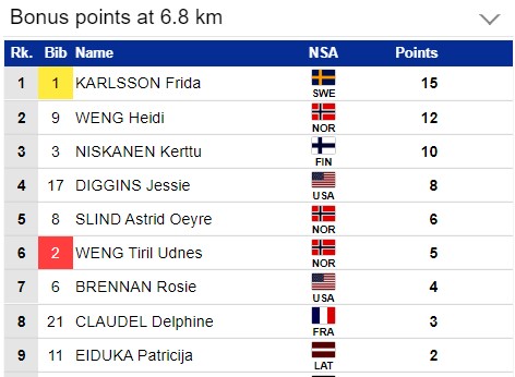 Фрида Карлссон 15-я, но она выигрывает Тур де Ски. Нисканен могла бы стать первой, только если бы выиграла эту гонку вместо Клодель.