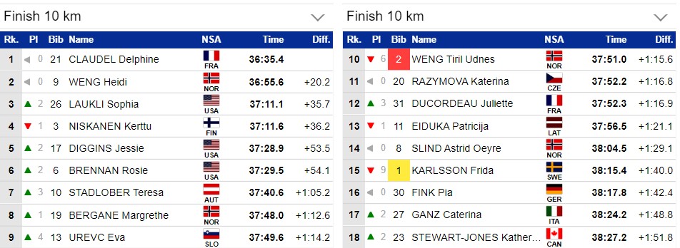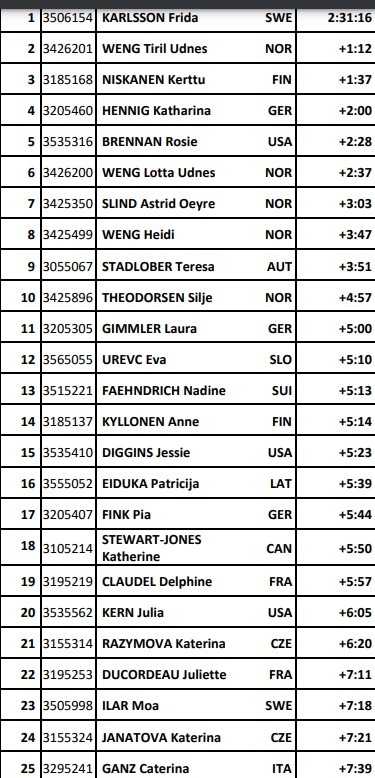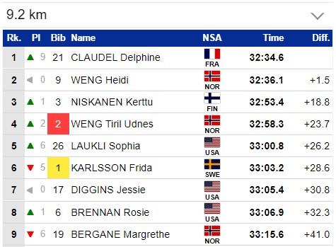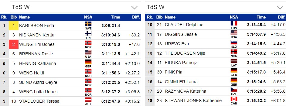 Фрида Карлссон 15-я, но она выигрывает Тур де Ски. Нисканен могла бы стать первой, только если бы выиграла эту гонку вместо Клодель.