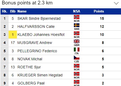 Скар лидирует пока у нас на отсечке 2.3 км и он же забирает максимум спринтерских очков, Хальварссон - второй, Клебо - третий.