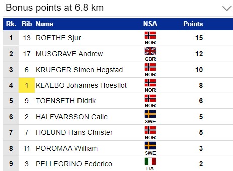 На второй спринтерской отсечке 6.8 км лидирует Рёте, Масгрейв - второй, Крюгер - третий, а Клебо - четвёртый.