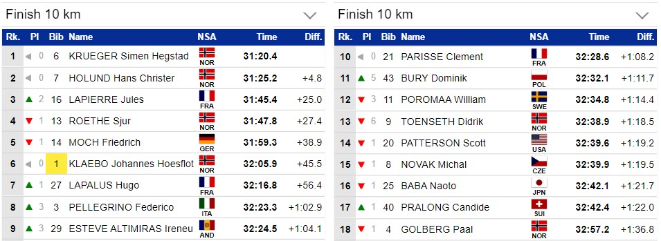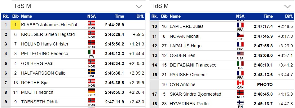 Третьим пришёл к финишу Жюль Лапьерр, далее Рёте и Мох. Клебо сегодня 6-й и этого хватило для победы на Тур де Ски. Минуту он выиграл у Крюгера.