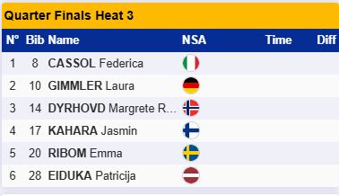 Лучший результат в этом забеге показала шведка Линн Сван — 3.50,0. Второе место заняла швейцарка Надин Файндрих. Таке ранее в полуфинал пробились шведка Моа Илар и Ясмин Йоэнсуу из Финляндии.