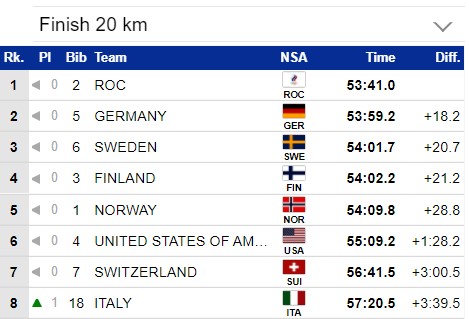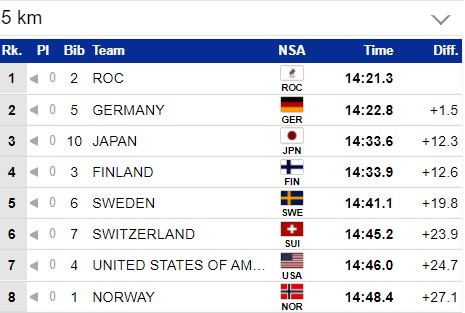 Передача эстафеты. Россия первая, далее Германия. Следом Япония и Финляндия. Швеция - пятая, а Норвегия только восьмая.