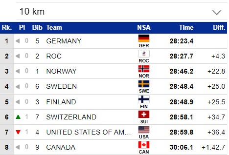 Передача эстафеты. Германия первая, далее Россия в 4 секундах. Норвегия отстала на 22, Йохауг фактически ничего не смогла отыграть. Швеция и Финляндия также в топ-5.