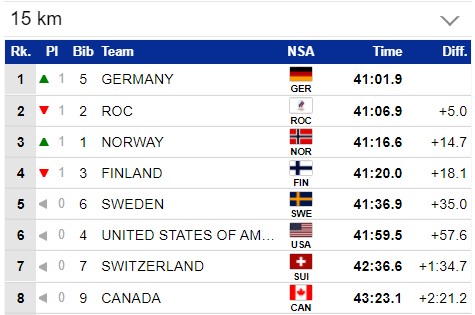 Передача эстафеты. Германия первая, Россия - вторая. Далее Норвегия и Финляндия, а Швеция отвалилась. Карлссон сильно сдала.