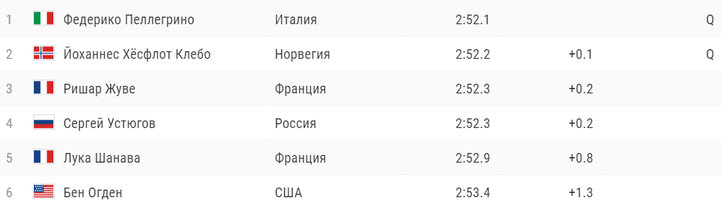 Соперники Устюгова в первом полуфинале: Йоханнес Клебо (Норвегия), Ришар Жуве (Франция), Федерико Пеллегрино (Италия), Лука Шанава (Франция), Бен Огден (США).