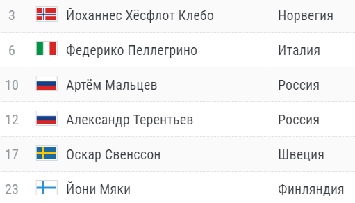 Разумеется норвежец Клебо финишировал в лидерах, пока у него вторая текущая позиция