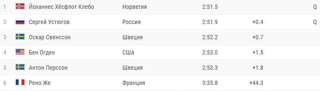 Соперники Устюгова в первом четвертьфинале: Йоханнес Клебо (Норвегия), Рено Же (Франция), Оскар Свенссон (Швеция), Бен Огден (США), Антон Перссон (Швеция).