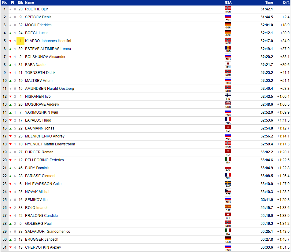 Победу одержал норвежский лыжник Сью Рёте, россиянин Денис Спицов завоевал серебро, замкнул тройку представитель Германии Фридрих Мох.