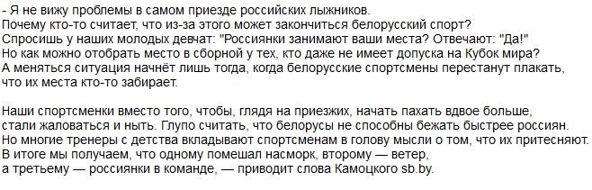 Главный тренер сборной Белоруссии Виктор Камоцкий заверил, что переезд лыжниц из России в Белоруссия не является проблемой для развития местных спортсменок.