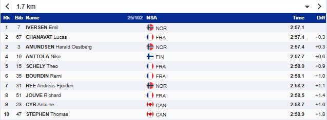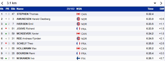 На отсечке 3.1 км Стефан и Амундсен продолжают лидировать, а Жюва обошёл Иверсен.