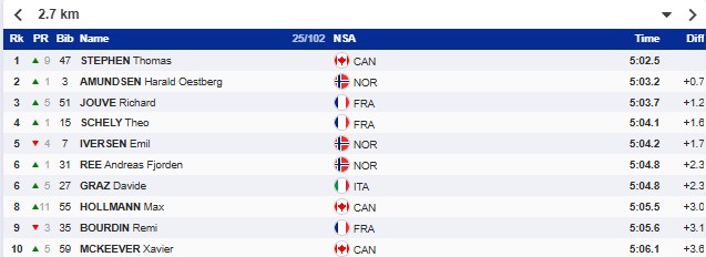 На отсечке 2.7 км лидирует уже Томас Стефан из Канады, Амундсен - второй, Жюв - третий.