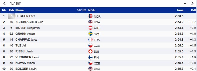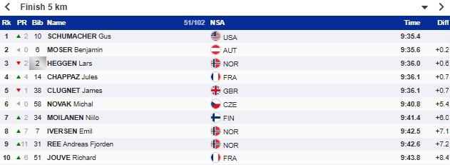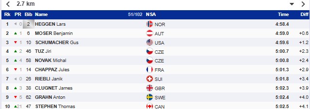 На отсечке 2.7 км Хегген продолжает лидировать. Мозер - второй. Шумахер - третий.