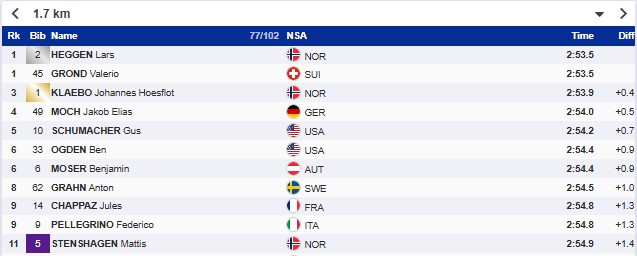 Поэтому пока на первой отсечке лидирует Эмиль Иверсен, втрое место у Люка Шанава, третий - Харальд Амундсен.