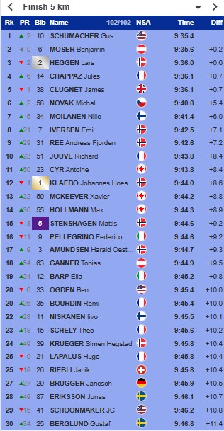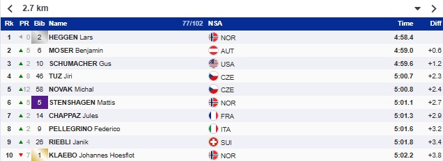 Стенсхаген - лидер этого забега на отсечке 2.7 км, но в общем зачёте он 6-й, Клебо - 10-й.