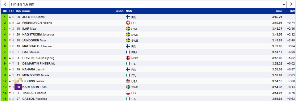 Спринт короткий - 1.6 км, сразу все и финишируют. Илар показывает первое время, Матинтало - вторая, Гал - третья.