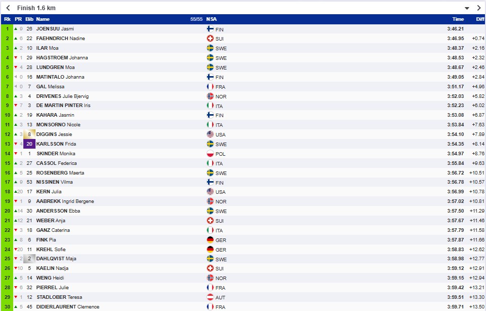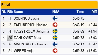 Файндрих обратно прошла Хегстрём на финише, но Йоэнсуу не достала. Лыжница из Финляндии побеждает сегодня.