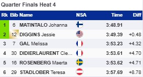 У Дидьелоран 30-е время и квалификация завершена. Непряева сегодня 41-я.