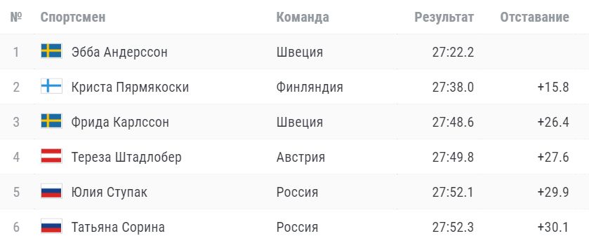 По сути, за 3 место ведут борьбу наша Татьяна Сорина и австрийка Тереза Штадлобер. С первыми двумя местами похоже всё ясно