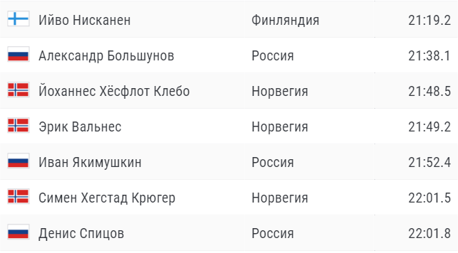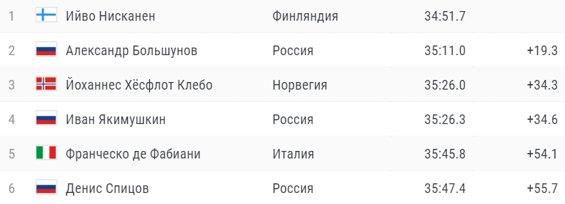 Отсечка 7.4 км. Это половина дистанции. Первый - финн Нисканен, Большунов - второй, а третьим прошёл этот отрезок норвежец Клебо