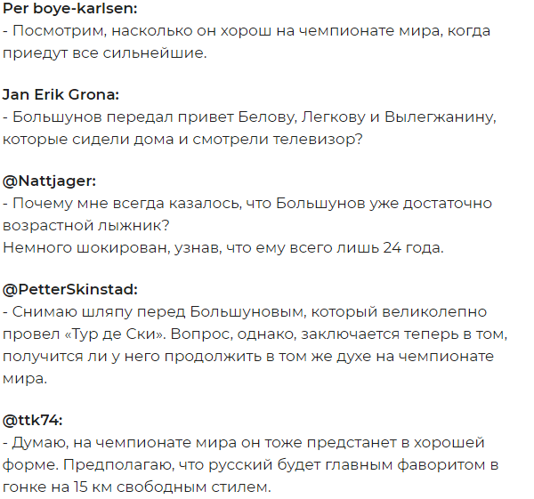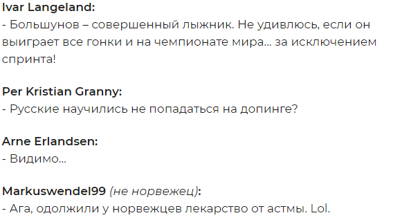 Другие любители спорта из Норвегии также поделились своим размышлениями о победах Большунова: