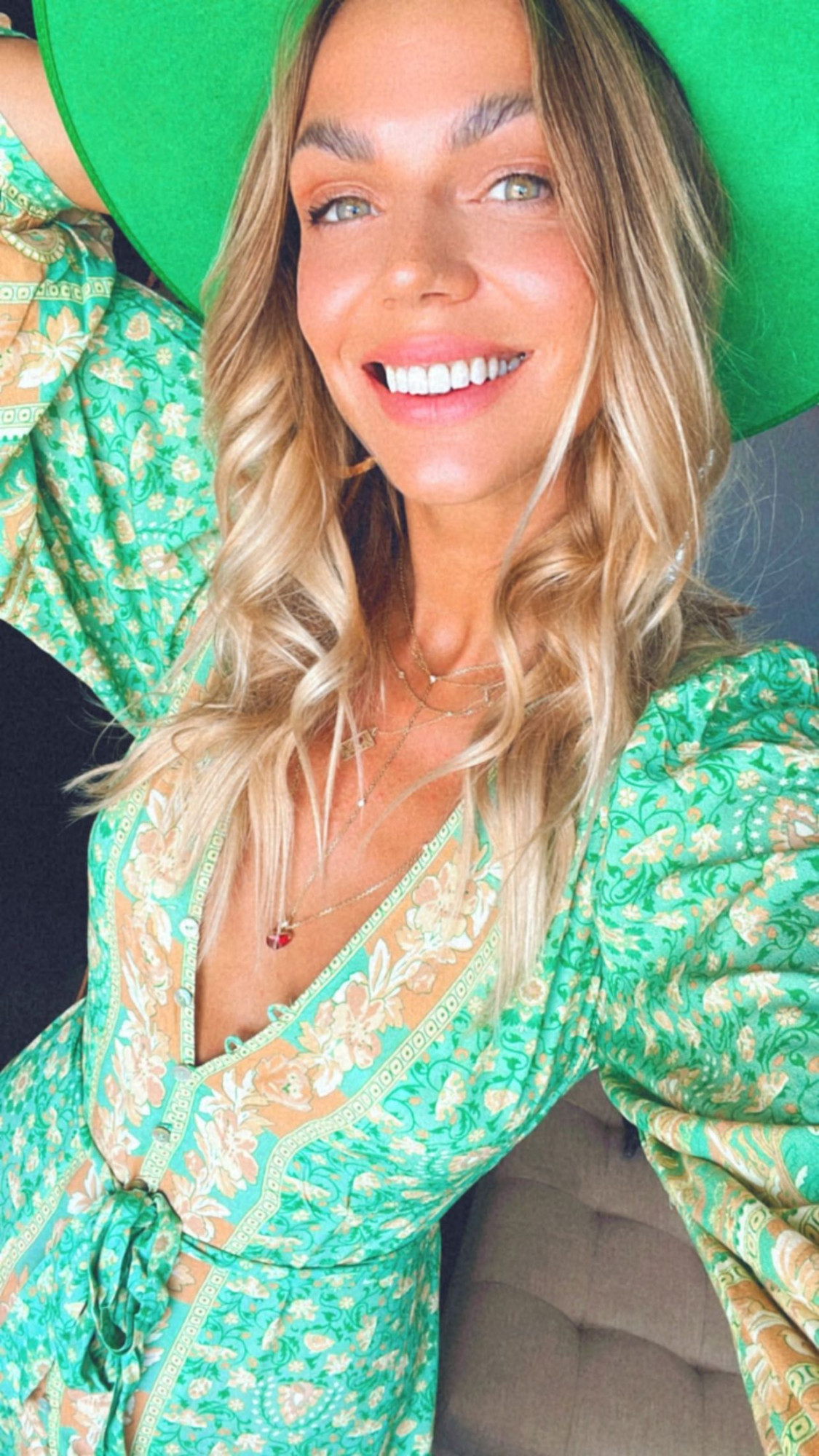 Спортсменка выложила яркое фото, где она позирует в зелёной шляпе и платье.