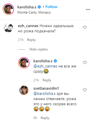 - Ножки идеальные, но рожа подкачала? - написал ezh_cannes.