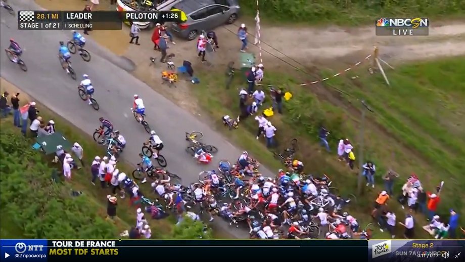 В субботу, 26 июня, в рамках стартового этапа веломногодневки "Тур де Франс" произошёл неприятный инцидент, спровоцированный неосторожными действиями одного из болельщиков, который пересёк ограничительную черту