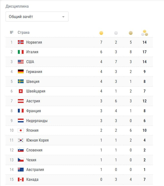 На второе место поднялась команда Италии (хозяева Игр) с впечатляющими 17 медалями (6 золотых, 3 серебряных, 8 бронзовых) — они лидируют по общему количеству наград.