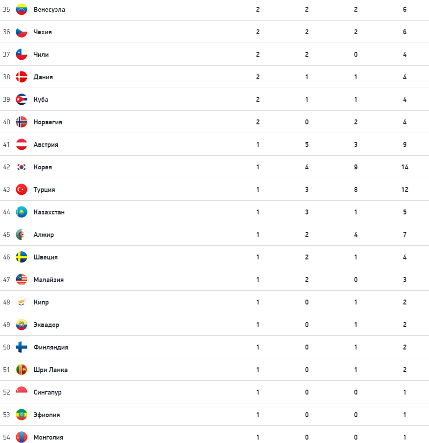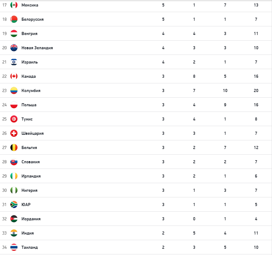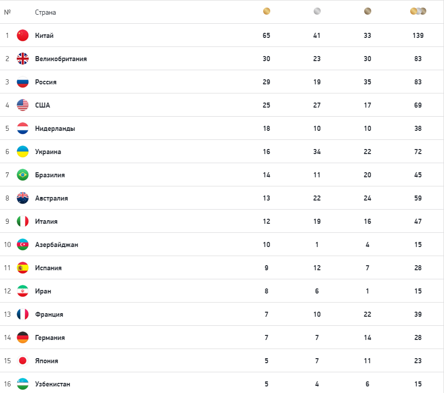 Россия находится на третьем месте в медальном зачёте. Второе место занимает Великобритания. Возглавляет медальный зачёт команда Китая.