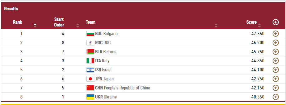 Пока тройка лидеров выглядит так: Болгария, Италия, Китай. А мы ждём Белоруссию и Россию!