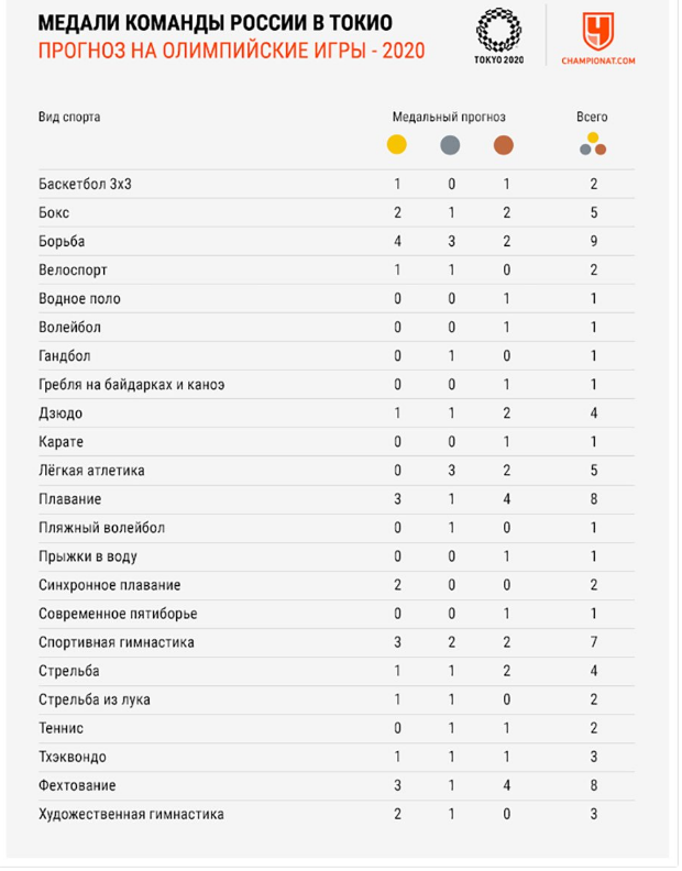 Коллеги из чемпионата попытались составить собственный медальный план сборной. Они полагают, что россияне завоюют 25 золотых, 20 серебряных и 29 бронзовых медалей. Можете сами посмотреть таблицу с прикидками.