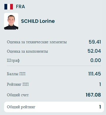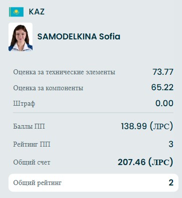 Хорошо откаталась Софья, исполнив двойной аксель, тройной флип, тройной лутц, двойной аксель+двойной тулуп, либелу 4, дорожку шагов 3, тройной лутц+ойлер+тройной сальхов, тройной флип+тройной тулуп, тройной риттбергер, заклон 3 и комбинацию вращений 3.