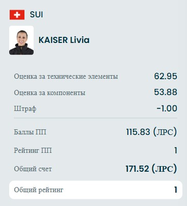 У Ливии ошибка на тройном флипе и падение с двойного акселя. Также она сделала тройной лутц+тройной тулуп, тройной риттбергер+двойной тулуп, тройной сальхов, тройной лутц+двойной аксель+двойной тулуп, тройной риттбергер, дорожку шагов 2, комбинационное вращение со сменой ноги 3 v и заклон 3.