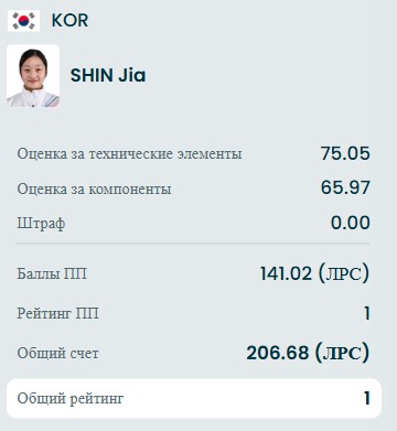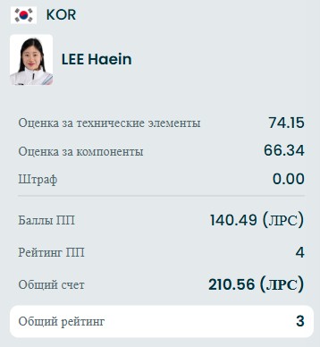 Ошиблась на тройном риттбергере кореянка, а всё остальное чисто: двойной аксель, тройной лутц+тройной тулуп, тройной сальхов, комбинация вращений 3, тройной флип+двойной тулуп+двойной риттбергер, тройной флип+двойной аксель, тройной лутц, либела 2, дорожка шагов 4.