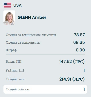 Долго все элементы были в зелёной зоне, но потом полился тройной риттбергер с касанием льда рукой. Чисто же Эмбер сделала тройной аксель, тройной флип+тройной тулуп, тройной лутц+двойной тулуп, тройной сальхов, волчок 4, тройной риттбергер+двойной аксель+двойной аксель, тройной флип, комбинацию вращений 4, тройной риттбергер, дорожку шагов 2 и заклон 4.
