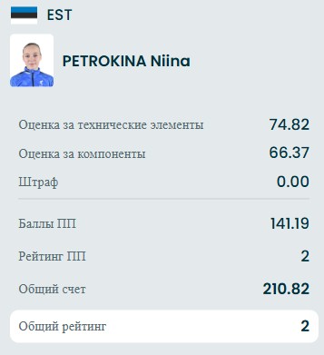 И также Аделия исполнила тройной сальхов, тройной риттбергер, либелу 4, тройной лутц+двойной аксель+двойной аксель, тройной флип+тройной тулуп, тройной флип, заклон 3, дорожку шагов 3, комбинацию вращений 4.