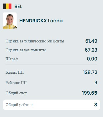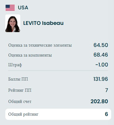 На старте сразу падение с тройного флипа и она лишилась каскада. Далее Изабо исполнила двойной аксель, тройной риттбергер, тройной сальхов, комбинационное вращение 4, тройной флип+двойной аксель, тройной риттбергер+двойной тулуп+двойной риттбергер, тройной лутц, заклон 3, дорожку шагов 3.